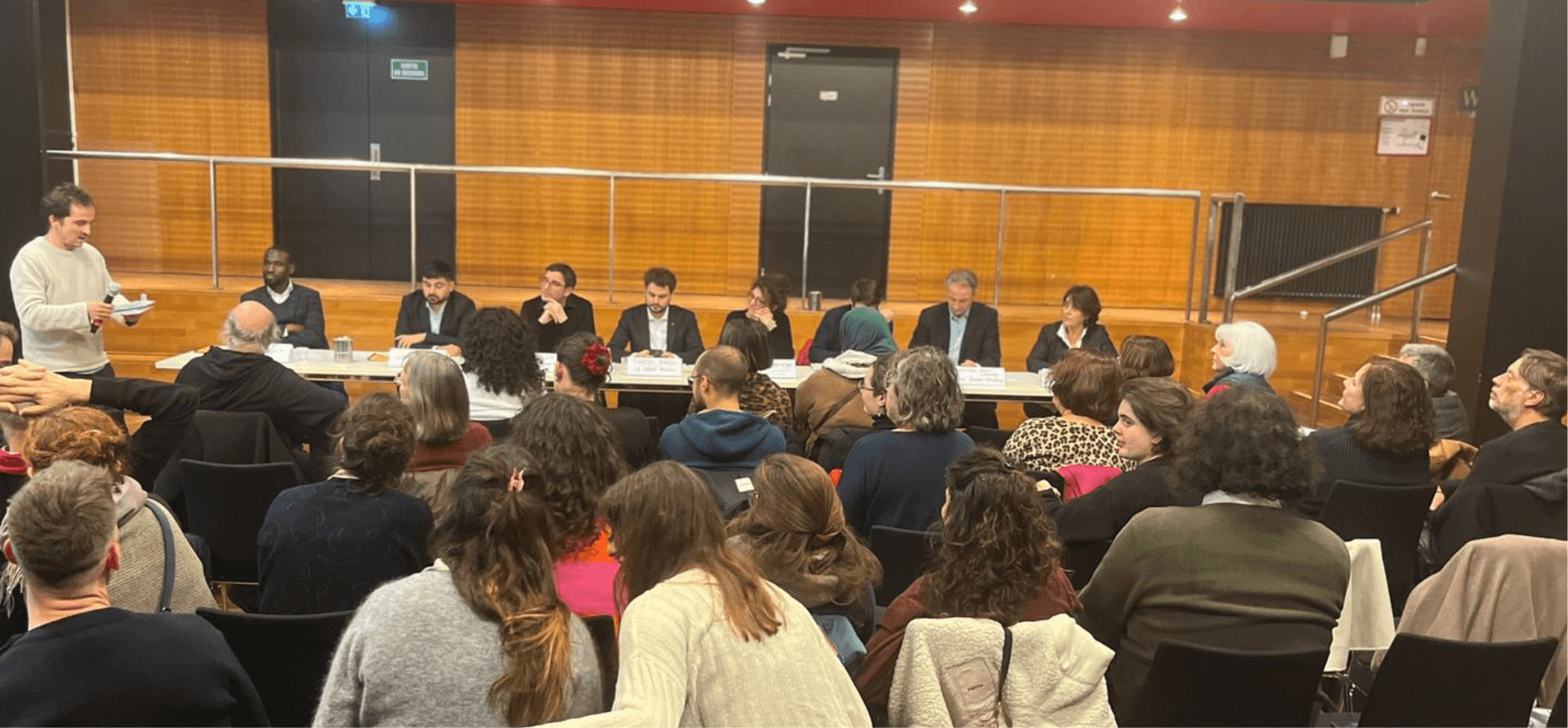 Le public a participé activement : tout au long de la table ronde, les questions ont été recueillies par écrit puis adressées aux candidat·es, invité·es à formuler des réponses concrètes et à exposer des visions claires, dans un temps de parole préalablement défini et identique pour chacun·e.