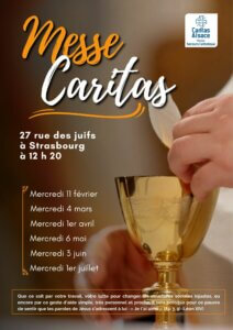 Les mercredis 11 février, 4 mars, 1er avril, 6 mai, 3 juin et 1er juillet à 12h20, Caritas Alsace vous propose d’assister à la messe un mercredi par mois à la Maison Diocésaine Saint Pierre.