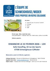 L’équipe Caritas de Schweighouse-sur-Moder vous propose un repas solidaire le dimanche 22 février à 12h à la salle Kaeufling à Schweighouse-sur-Moder